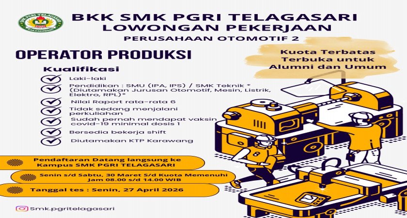 SMK PGRI Telagasari melalui Bursa Kerja Khusus (BKK) kembali membuka kesempatan kerja bagi alumni dan masyarakat umum untuk bergabung di perusahaan otomotif terkemuka.